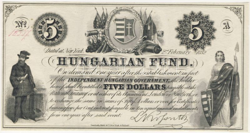 Leírás: Emigrációs "Kossuth bankó" 1852. 5$ piros számozás T:I