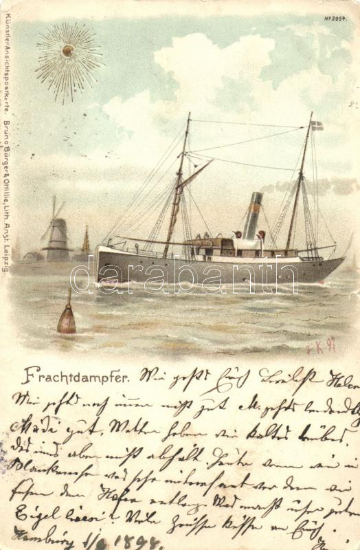 1898 Frachtdampfer, Bruno Bürger & Ottillie litho (small tear) https://www.darabanth.com/hu/7-Nagyaukcio/7.1/Motivum-kepeslapok/Hajo-Ship-Schiff~1887/1898-Frachtdampfer-Bruno-Burger-Ottillie-litho-small-tear~II171610