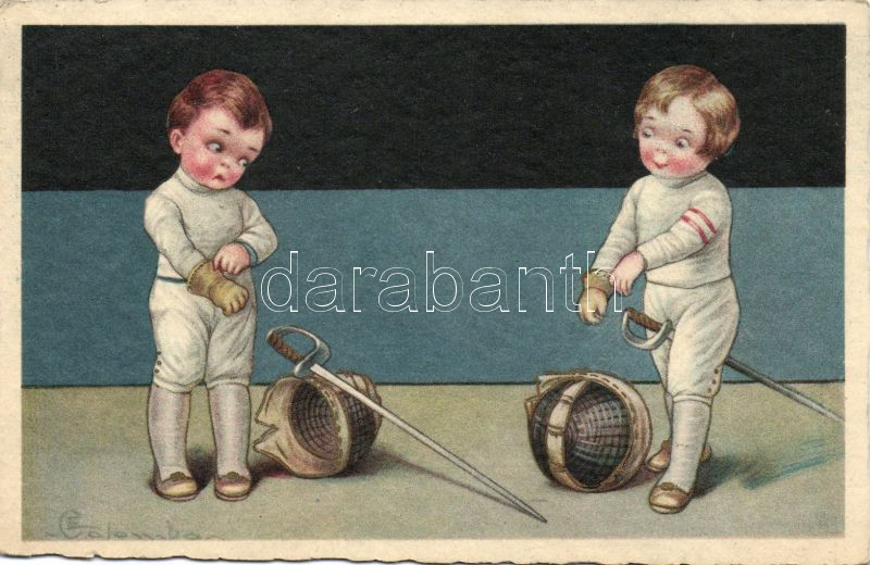 Fencing children s: Colombo https://www.darabanth.com/hu/7-Nagyaukcio/7.1/Motivum-kepeslapok/Muvesz-Artist-signed-Kunstler-signiert~1861/Fencing-children-s-Colombo~II170322