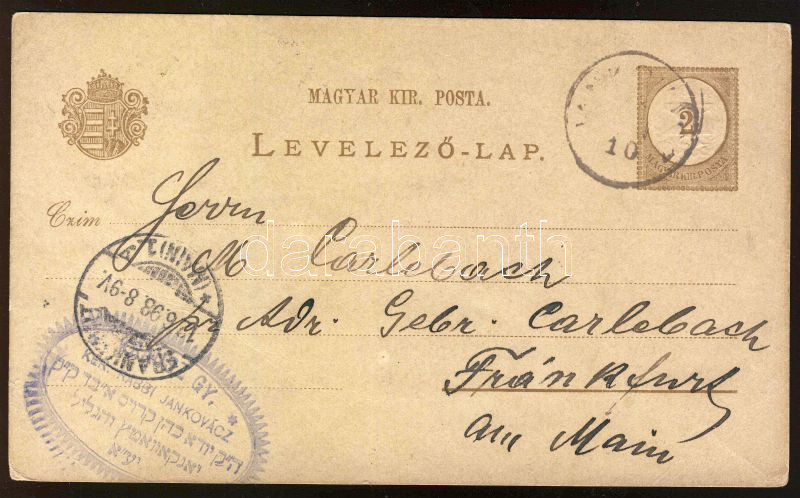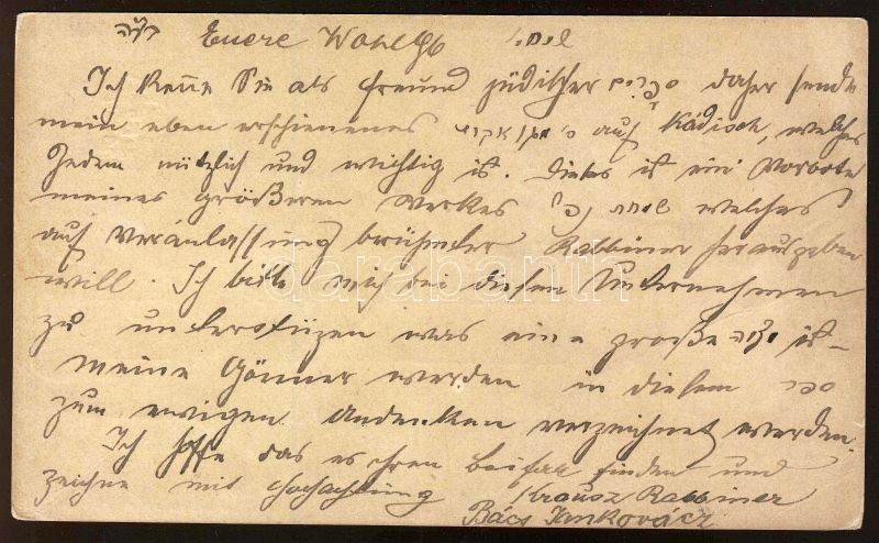 1898 Krausz György jankováci kerületi rabbi saját kézzel írott levelezőlapja / Handwritten postcard og Gy. Krausz, regional rabbi of Jankovác to Frankfurt