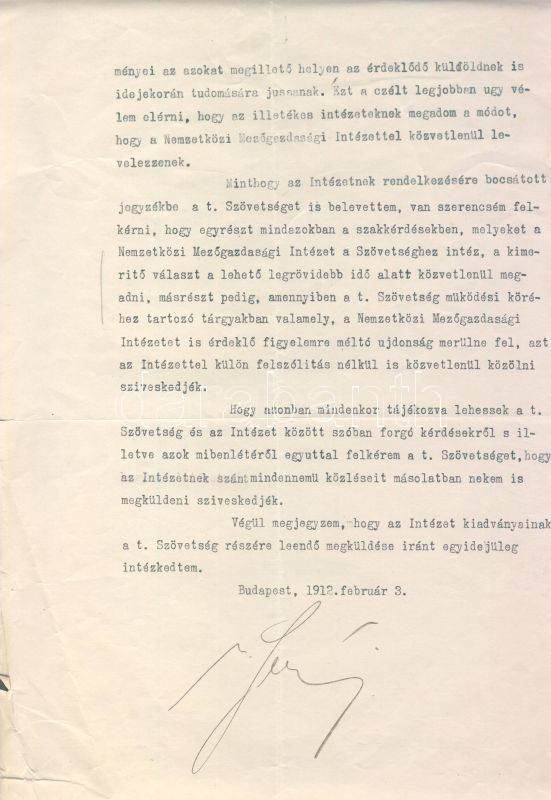 Leírás: 1912 Serényi Béla földművelésügyi miniszter aláírása levélen