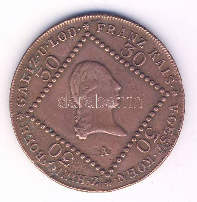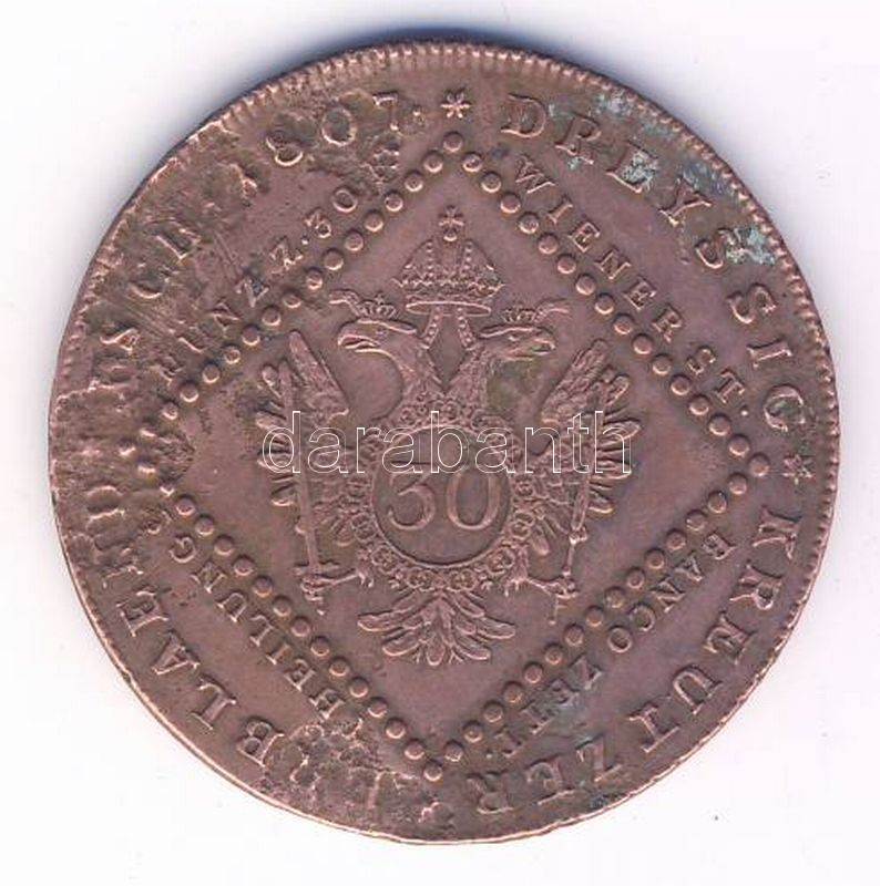 https://www.darabanth.com/hu/70-Gyorsarveres/70.0/Numizmatika/Kulfoldi-fem-es-ezustpenzek~259/Ausztria-1807A-30Kr-T3~II140304