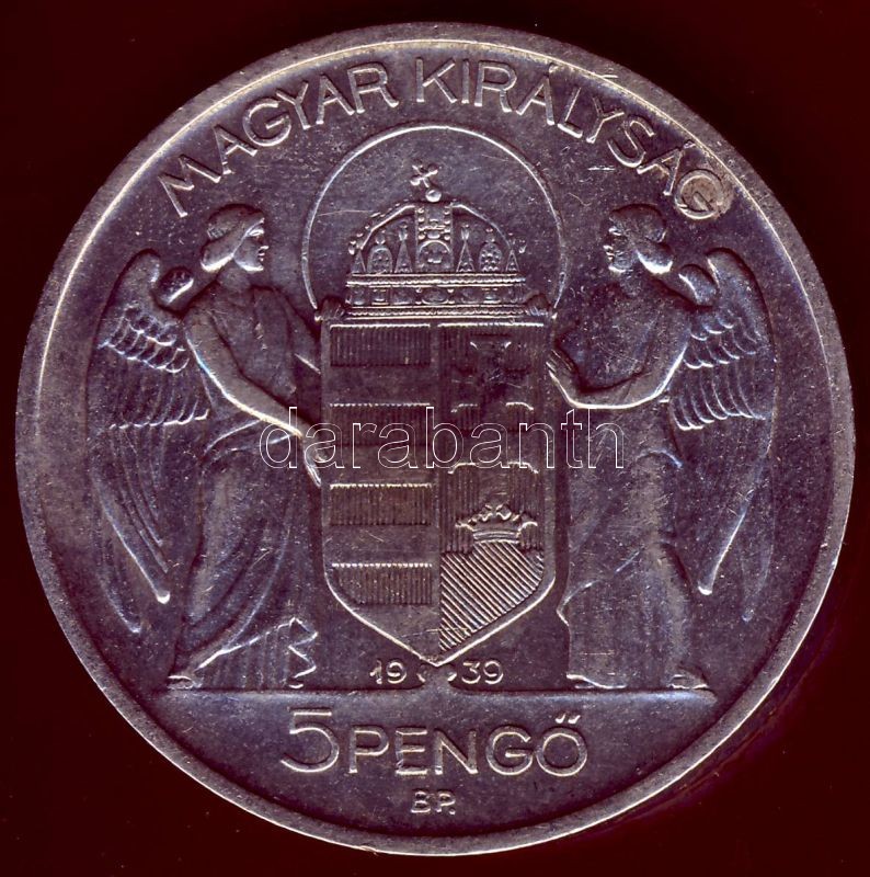 1939. 5P Ag "Horthy balra" T:1/2 https://www.darabanth.com/hu/70-Gyorsarveres/70.0/Numizmatika/Magyar-es-magyar-verdejelu-fem-es-ezustpenzek~260/1939-5P-Ag-Horthy-balra-T12~II140457