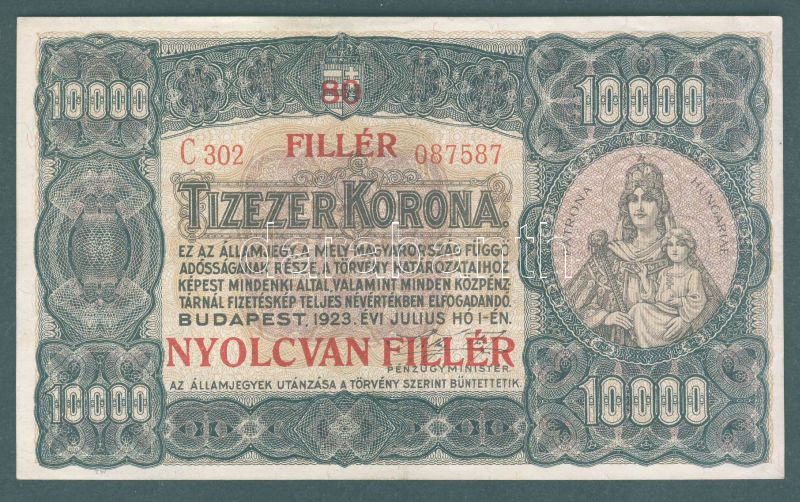 Leírás: 1923. 10000K "80 fillér" fny-sal T:II+, (majdnem I-) hajtva, de törve nem