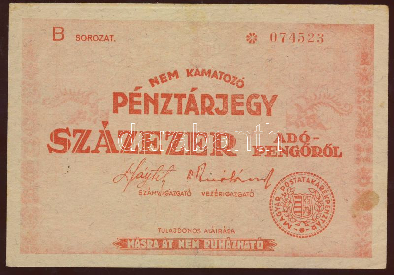 1946. 100.000AP pénztárjegy nagyobb piros festékfolttal T:II https://www.darabanth.com/hu/70-Gyorsarveres/70.0/Numizmatika/Osztrakmagyar-magyar-es-magyar-vonatkozasu-bankjegyek~252/1946-100000AP-penztarjegy-nagyobb-piros-festekfolttal-TII~II140622