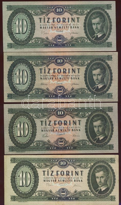 1957, 1962, 1969, 1975.10Ft 4 klf T:II+,II https://www.darabanth.com/hu/70-Gyorsarveres/70.0/Numizmatika/Osztrakmagyar-magyar-es-magyar-vonatkozasu-bankjegyek~252/1957-1962-1969-197510Ft-4-klf-TIIplus-II~II140592