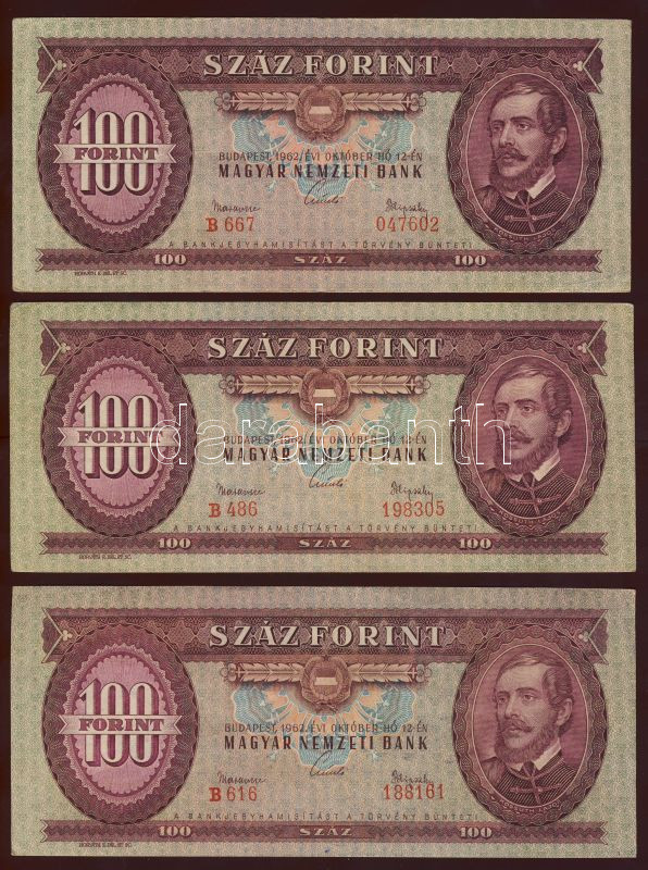https://www.darabanth.com/hu/70-Gyorsarveres/70.0/Numizmatika/Osztrakmagyar-magyar-es-magyar-vonatkozasu-bankjegyek~252/1962-100Ft-3x-TII~II140681