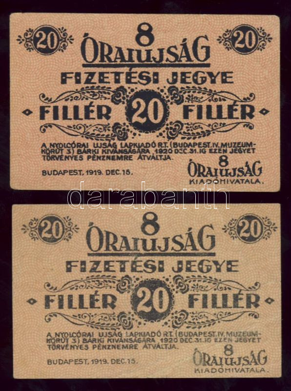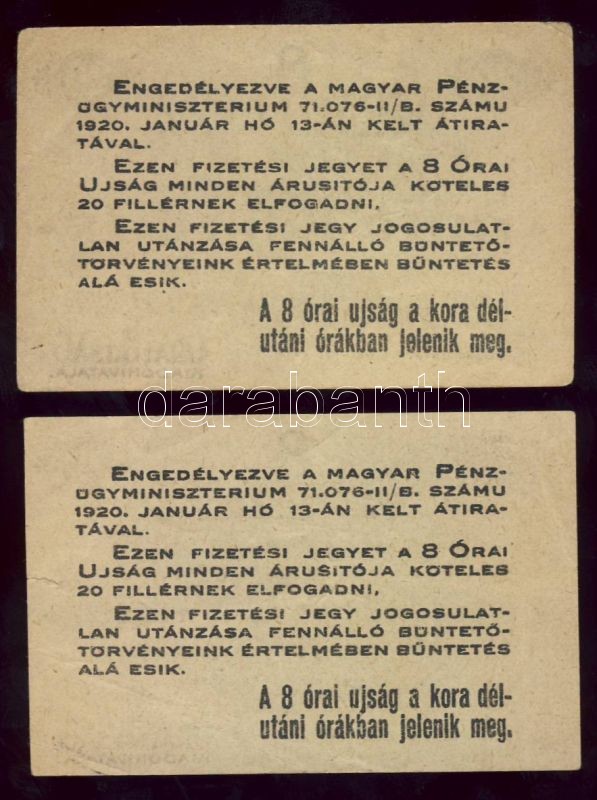 Leírás: 1919. "8 órai újság" fizetési jegye 20f-ről (2x) T:II,III