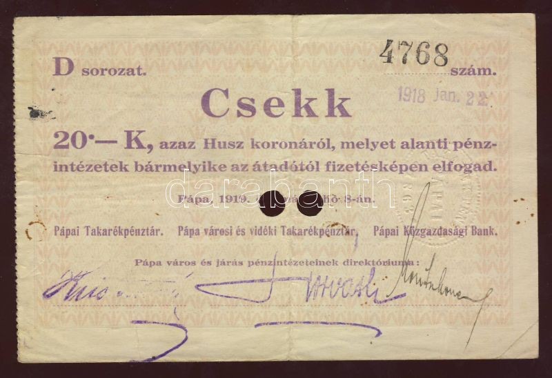 1919. "Pápai csekk" 10K,20K,50K T:III https://www.darabanth.com/hu/70-Gyorsarveres/70.0/Numizmatika/Papir-es-fem-szuksegpenzek-hadifogolypenzek-fantaziapenzek-penzhelyettesito-bonok~256/1919-Papai-csekk-10K-20K-50K-TIII~II140506