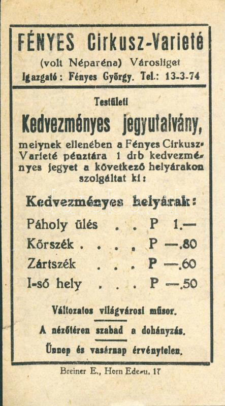 1930-as évek "Fényes Cirkusz-Varieté" bón-jegyutalvány https://www.darabanth.com/hu/70-Gyorsarveres/70.0/Numizmatika/Papir-es-fem-szuksegpenzek-hadifogolypenzek-fantaziapenzek-penzhelyettesito-bonok~256/1930-as-evek-Fenyes-Cirkusz-Variete-bon-jegyutalvany~II140575