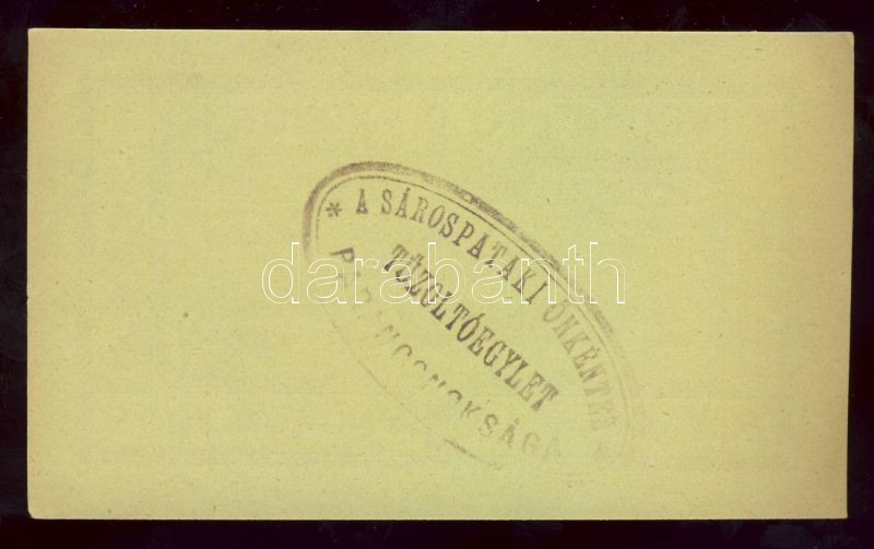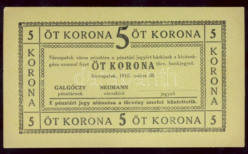 Leírás: Sárospatak 1919. 5K előlap aláírás és sorszám nélkül, hátlapon lila bélyegző T:I