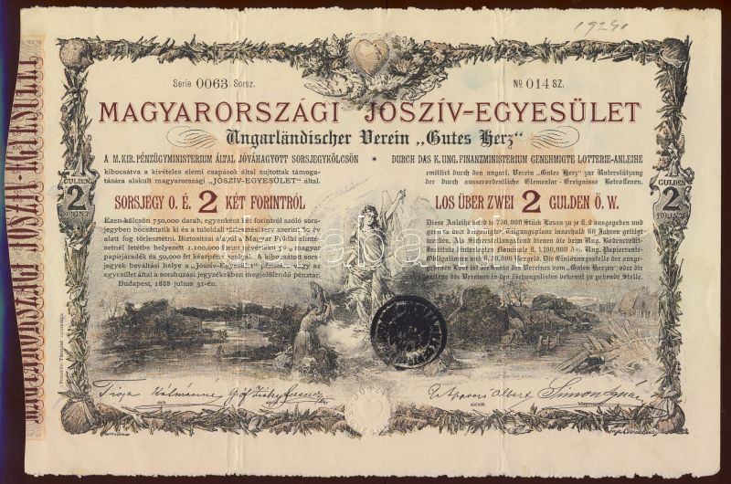 1888. "Jószív-Egyesület" sorsjegye 2Ft-ról https://www.darabanth.com/hu/70-Gyorsarveres/70.0/Numizmatika/Reszvenyek-ertekpapirok-sorsjegyek-takarekbetetkonyvek~263/1888-Josziv-Egyesulet-sorsjegye-2Ft-rol~II140476