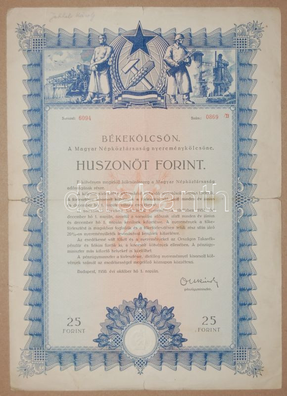 Leírás: 1950. Békekölcsön 25Ft