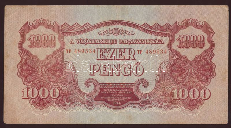 1944. 1000P "V.H." T:II/III https://www.darabanth.com/hu/72-Gyorsarveres/72.0/Numizmatika/Osztrakmagyar-magyar-es-magyar-vonatkozasu-bankjegyek~199/1944-1000P-VH-TIIIII~II144649