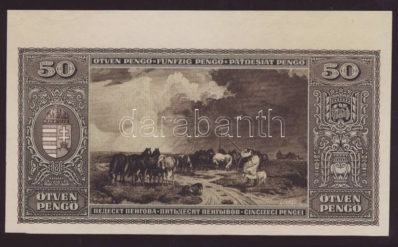 1945. 50P csak hátlapi nyomat felső ívszéllel T:I https://www.darabanth.com/hu/72-Gyorsarveres/72.0/Numizmatika/Osztrakmagyar-magyar-es-magyar-vonatkozasu-bankjegyek~199/1945-50P-csak-hatlapi-nyomat-felso-ivszellel-TI~II144623