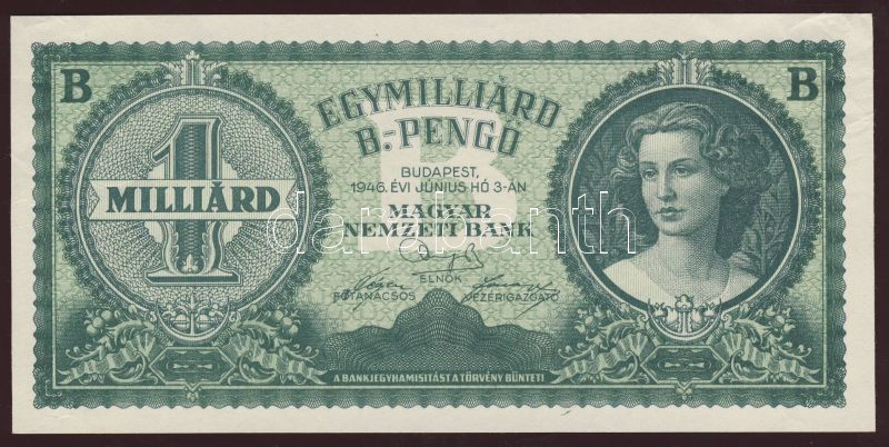 1946. 1000.000.000B.-pengő "zöld" T:II+ https://www.darabanth.com/hu/72-Gyorsarveres/72.0/Numizmatika/Osztrakmagyar-magyar-es-magyar-vonatkozasu-bankjegyek~199/1946-1000000000B-pengo-zold-TIIplus~II144633