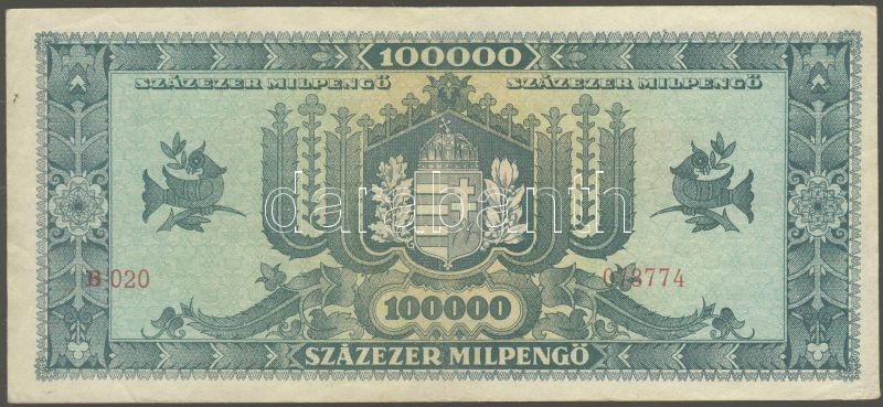 Leírás: 1946. 100.000Milpengő sorozat- és sorszám extrém balra csúszva! T:II