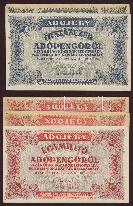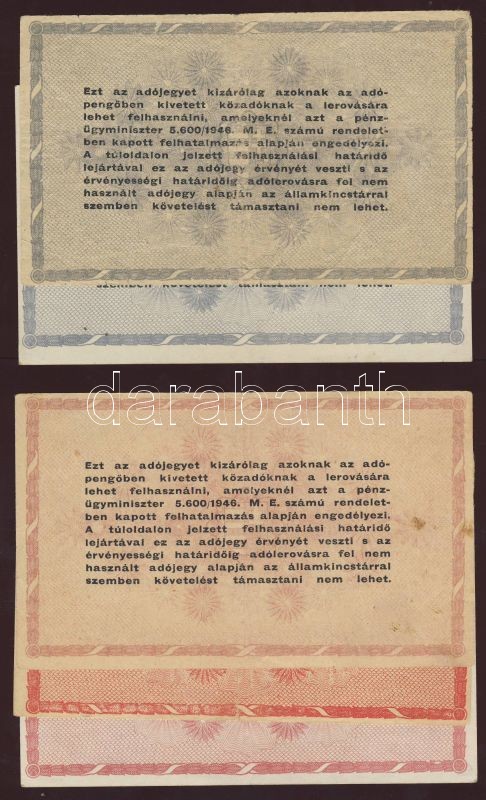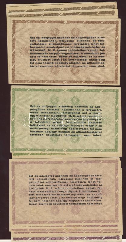 Leírás: 1946. Adópengő tétel 10.000AP (5x) variánsokkal, 50.000AP (3x), 100.000AP (5x) variánsokkal, 500.000AP (2x) variánsokkal, 1000.000AP (3x) variánsokkal összesen 17db