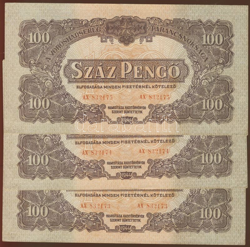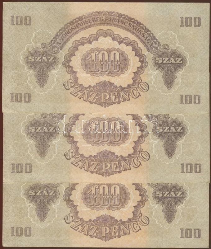 Leírás: 1944. "V.H." 100P (3x) egymásutáni sorszámmal T:I,I-