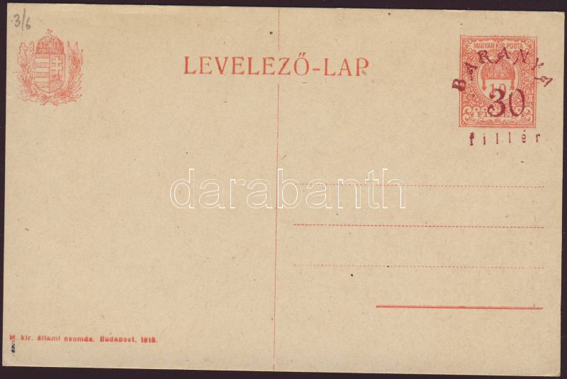 Leírás: Baranya 1919 használatlan díjjegyes levelezőlap Bodor vizsgálójellel