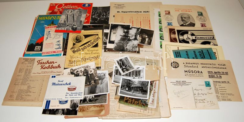 Leírás: Kis vegyes tétel: fényképek, reklámok, okmányok, levélzárók, nyomtatványok, érdemes megnézni