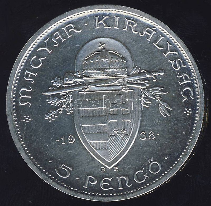 1938. 5P Ag "Szt. István" T:1/2 https://www.darabanth.com/hu/76-Gyorsarveres/76.0/Numizmatika/Magyar-es-magyar-verdejelu-fem-es-ezustpenzek~215/1938-5P-Ag-Szt-Istvan-T12~II152668