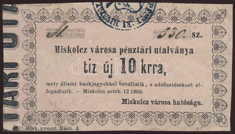 Miskolc 1860. 10kr sötét rózsaszín papíron T:I https://www.darabanth.com/hu/76-Gyorsarveres/76.0/Numizmatika/Papir-es-fem-szuksegpenzek-hadifogolypenzek-fantaziapenzek-penzhelyettesito-bonok~208/Miskolc-1860-10kr-sotet-rozsaszin-papiron-TI~II152654