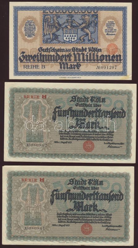 Német Birodalom/Weimar/Köln 1923. 50.000M, 100.000M, 500.000M (2x) egy... https://www.darabanth.com/hu/76-Gyorsarveres/76.0/Numizmatika/Papir-es-fem-szuksegpenzek-hadifogolypenzek-fantaziapenzek-penzhelyettesito-bonok~208/Nemet-BirodalomWeimarKoln-1923-50000M-100000M-500000M-2x-egymasutani-sorszamokkal-2~II152568