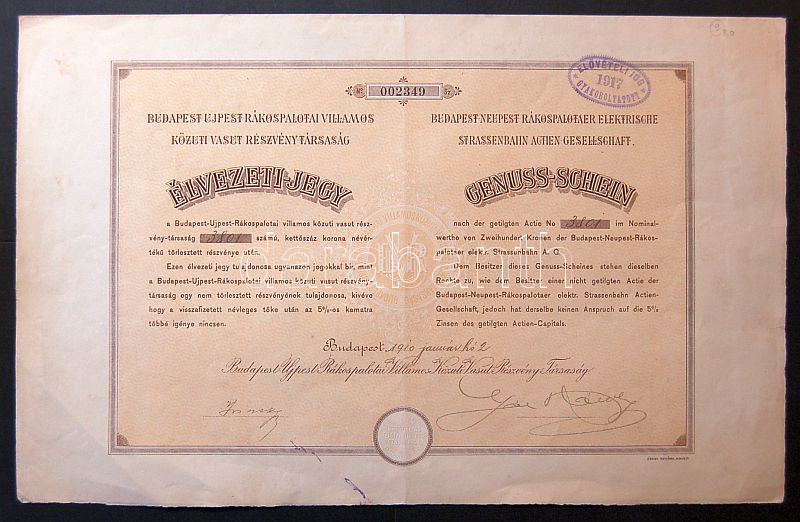 1910. "Budapesti Rákospalotai Villamos Közuti Vasut Részvény-Társaság"... https://www.darabanth.com/hu/76-Gyorsarveres/76.0/Numizmatika/Reszvenyek-ertekpapirok-sorsjegyek-takarekbetetkonyvek~217/1910-Budapesti-Rakospalotai-Villamos-Kozuti-Vasut-Reszveny-Tarsasag-elvezeti-jegye-200K-rC3~II152609