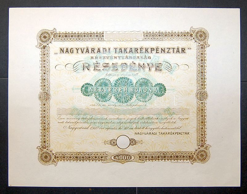 1910. "Nagyváradi Takarékpénztár" részvénye 4000K-ról https://www.darabanth.com/hu/76-Gyorsarveres/76.0/Numizmatika/Reszvenyek-ertekpapirok-sorsjegyek-takarekbetetkonyvek~217/1910-Nagyvaradi-Takarekpenztar-reszvenye-4000K-rol~II152613