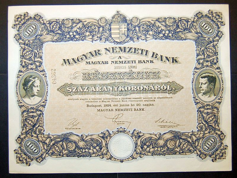 1924. "Magyar Nemzeti Park" részvénye 100 Aranykoronáról https://www.darabanth.com/hu/76-Gyorsarveres/76.0/Numizmatika/Reszvenyek-ertekpapirok-sorsjegyek-takarekbetetkonyvek~217/1924-Magyar-Nemzeti-Park-reszvenye-100-Aranykoronarol~II152610