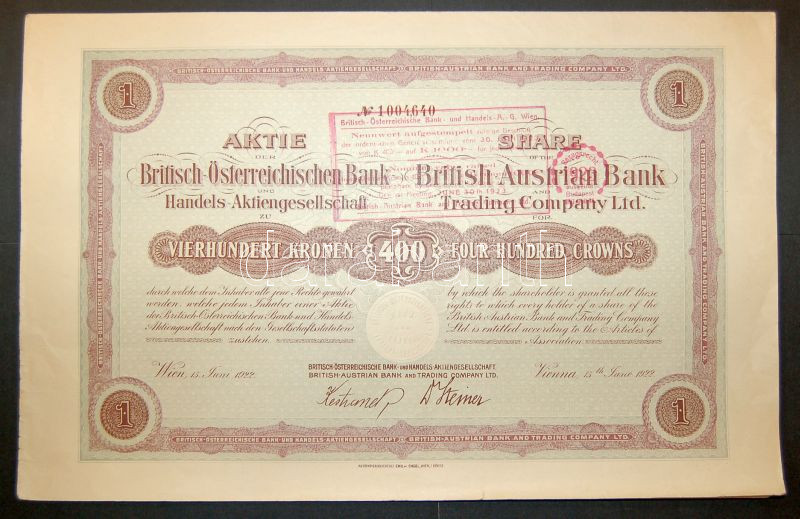Leírás: Ausztria 1922. "Britisch-Österreichischen Bank" részvénye 400K-ról