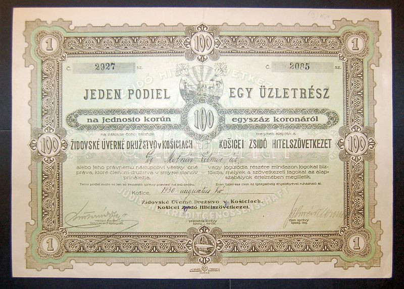 Cseszlovákia 1930. "Kosicei Zsidó Hitelszövetkezet" üzletrésze 100K-ró... https://www.darabanth.com/hu/76-Gyorsarveres/76.0/Numizmatika/Reszvenyek-ertekpapirok-sorsjegyek-takarekbetetkonyvek~217/Cseszlovakia-1930-Kosicei-Zsido-Hitelszovetkezet-uzletresze-100K-rol~II152608