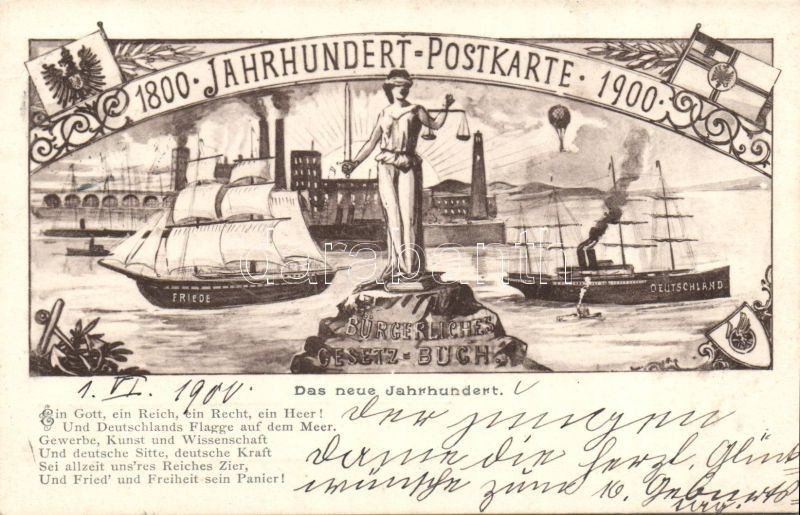 Leírás: Postcard, ship, law, industry, baloon, train in XX. century