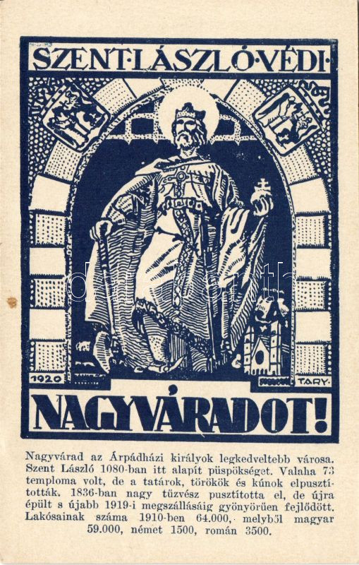 Szt. László defends Nagyvárad https://www.darabanth.com/hu/8-Nagyaukcio/8.1/Motivum-kepeslapok/Propaganda~2073/Szt-Laszlo-defends-Nagyvarad~II208504