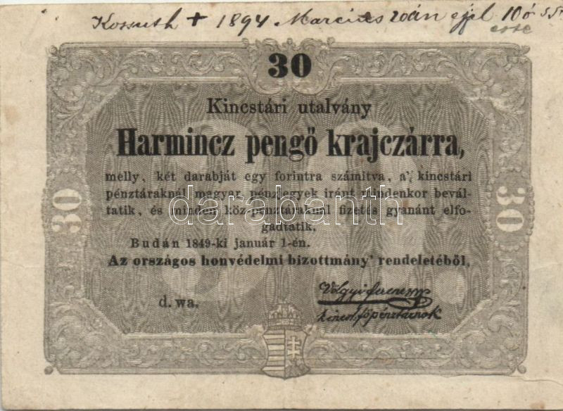 Leírás: 1849. 30kr "Kossuth bankó" érdekes "Kossuth + 1894. Március 20-án éjjel 10ó 35 este" kézzelírott szöveggel T:II papírránccal