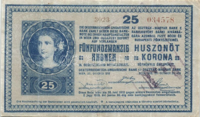 Leírás: 1918. 25K "sima" "3023" sorozatszámmal, nehezen olvasható lila ellenbélyegzővel T:restaurált