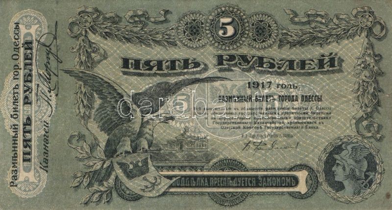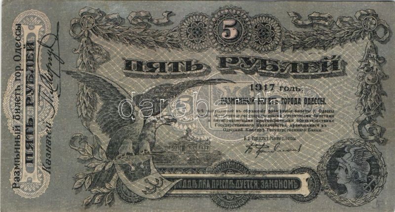 Orosz Polgárháború/ Ukrajna és Krím/ Ogyessza 1917. 5R 3klf színvarián... https://www.darabanth.com/hu/82-Gyorsarveres/82.0/Numizmatika/Kulfoldi-bankjegyek~247/Orosz-Polgarhaboru-Ukrajna-es-Krim-Ogyessza-1917-5R-3klf-szinvarians-TII~II173738