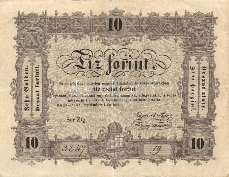 1848. 10Ft "Kossuth bankó" T:II/III https://www.darabanth.com/hu/82-Gyorsarveres/82.0/Numizmatika/Osztrakmagyar-magyar-es-magyar-vonatkozasu-bankjegyek~248/1848-10Ft-Kossuth-banko-TIIIII~II173764