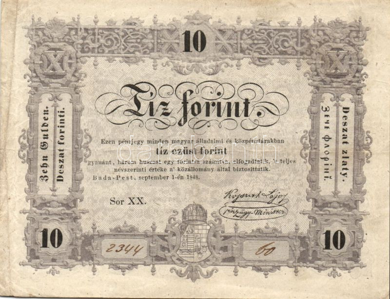 1848. 10Ft "Kossuth bankó" T:II/III https://www.darabanth.com/hu/82-Gyorsarveres/82.0/Numizmatika/Osztrakmagyar-magyar-es-magyar-vonatkozasu-bankjegyek~248/1848-10Ft-Kossuth-banko-TIIIII~II173766