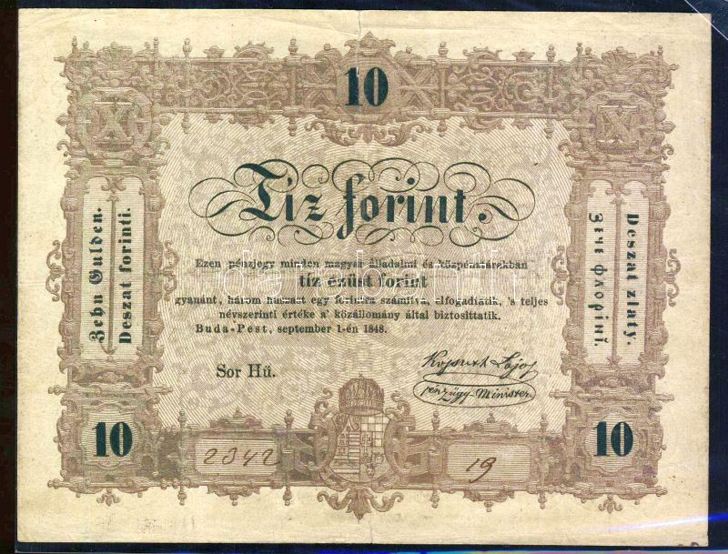 1848. 10Ft "Kossuth bankó" hátlapi fordított alapnyomattal T:III/IV https://www.darabanth.com/hu/82-Gyorsarveres/82.0/Numizmatika/Osztrakmagyar-magyar-es-magyar-vonatkozasu-bankjegyek~248/1848-10Ft-Kossuth-banko-hatlapi-forditott-alapnyomattal-TIIIIV~II172893