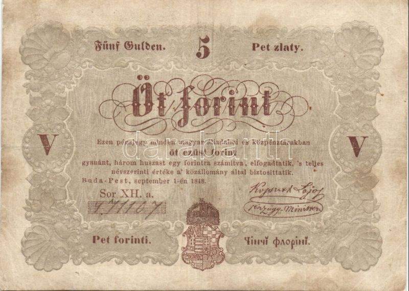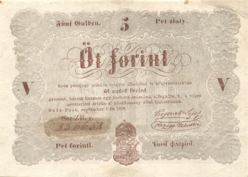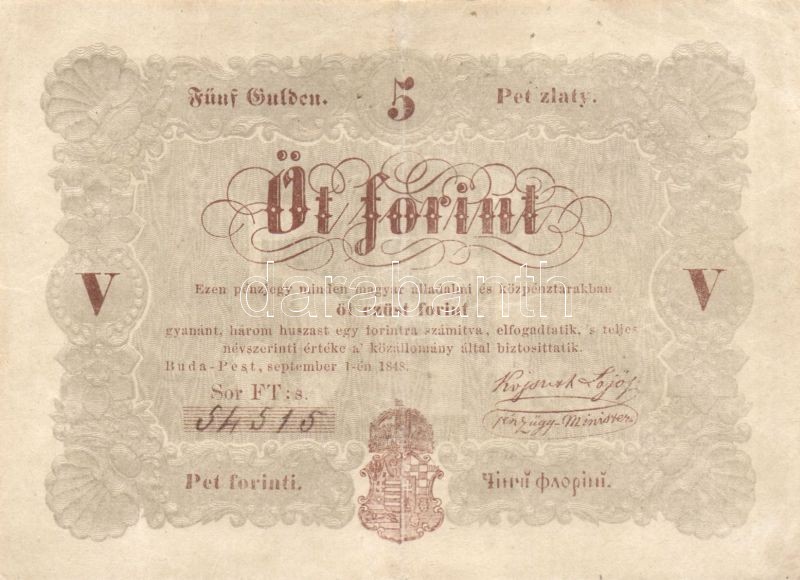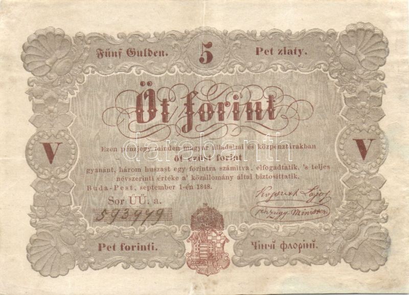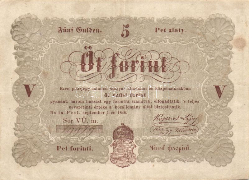 1848. 5Ft "Kossuth bankó" barna (5x) benne értékszám elcsúszás, "flori... https://www.darabanth.com/hu/82-Gyorsarveres/82.0/Numizmatika/Osztrakmagyar-magyar-es-magyar-vonatkozasu-bankjegyek~248/1848-5Ft-Kossuth-banko-barna-5x-benne-ertekszam-elcsuszas-florini-szoban-ll-teves-~II173058
