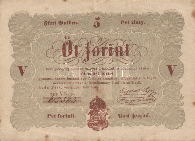 Leírás: 1848. 5Ft "Kossuth bankó" barna T:III+