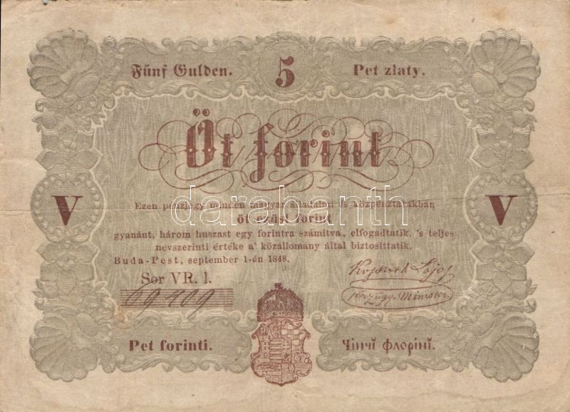 Leírás: 1848. 5Ft "Kossuth bankó" barna T:III+