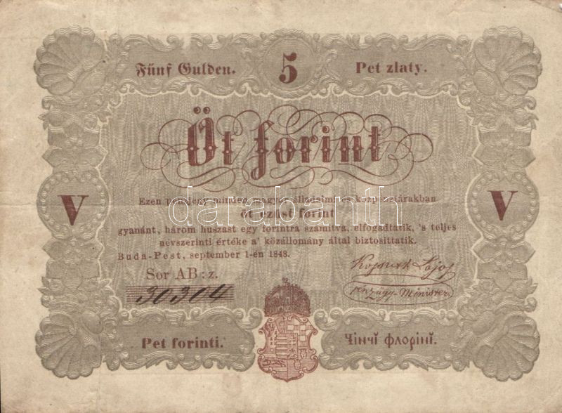 Leírás: 1848. 5Ft "Kossuth bankó" barna T:III+