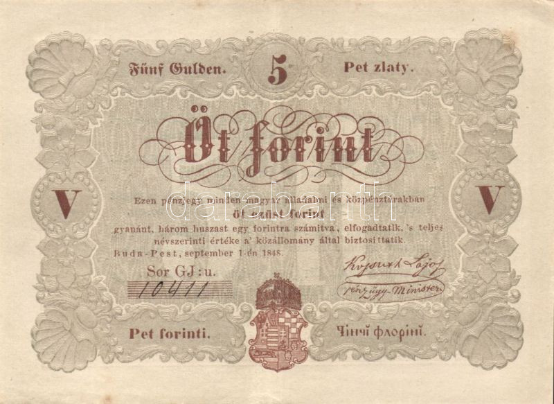 Leírás: 1848. 5Ft "Kossuth bankó" barna T:II
