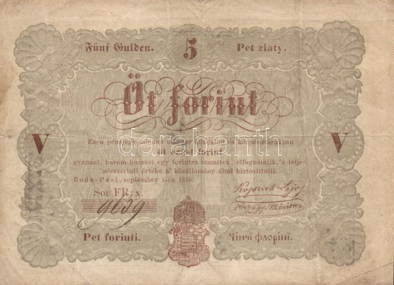 1848. 5Ft "Kossuth bankó" barna, előlapi címer balra tolódva, ismeretl... https://www.darabanth.com/hu/82-Gyorsarveres/82.0/Numizmatika/Osztrakmagyar-magyar-es-magyar-vonatkozasu-bankjegyek~248/1848-5Ft-Kossuth-banko-barna-elolapi-cimer-balra-tolodva-ismeretlen-eredetu-belyegzok-rC3~II172857