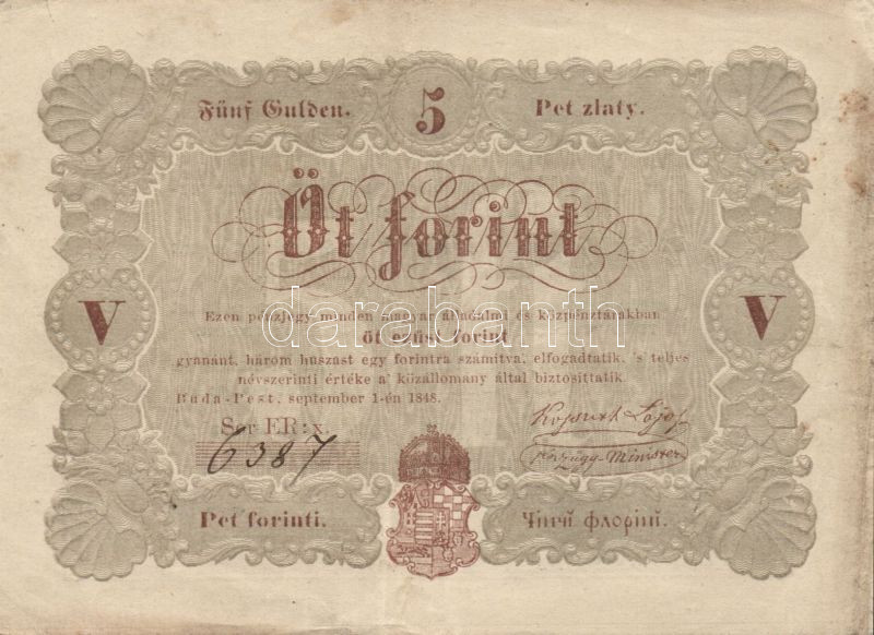 Leírás: 1848. 5Ft "Kossuth bankó" barna, előlapi "florini" szóban "ll" nyomtatási hiba, hátlap erősen oxidálódva! T:II-