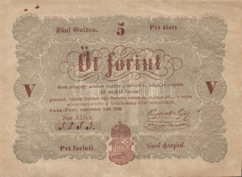 Leírás: 1848. 5Ft "Kossuth bankó" barna, előlapi kézzel írott számozás után pont, jobb felső sarokban 2db nyomdafesték pötty T:II