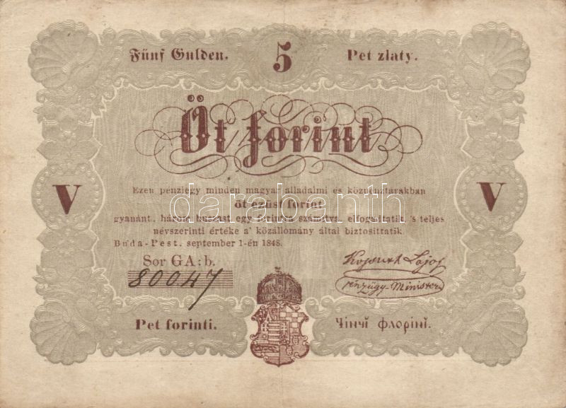 Leírás: 1848. 5Ft "Kossuth bankó" barna, előlapon "alladalmi" tévnyomat + "Pest" szó után pont vessző helyett! T:II-